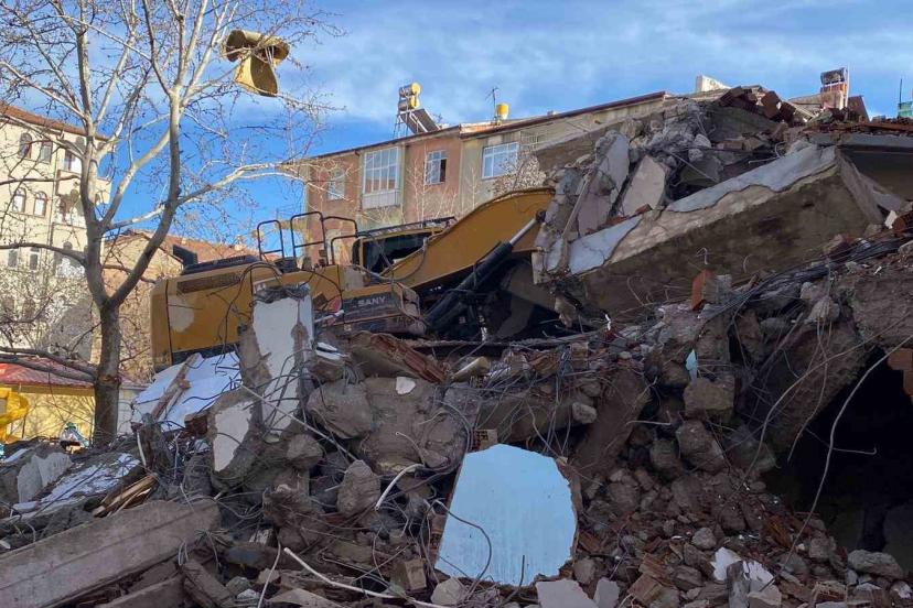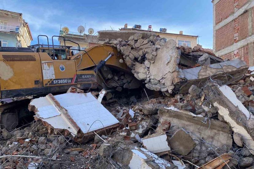 Elazığ’da 6 Şubat 2023 depremlerinde ağır hasar alan bina, yıkım esnasında iş makinesinin üstüne yıkıldı.