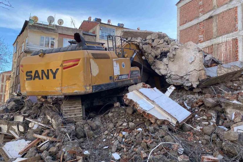 Kahramanmaraş’ta 6 Şubat 2023’te meydana gelen yıkıcı depremlerden etkilenen Elazığ’da ağır hasarlı binaların yıkımı devam ediyor. Rızaiye Mahallesi Şehit Teğmen Nadir Ozan Sokak’ta bulunan 4 katlı binada başlatılan yıkım çalışmalarında iş makinesinin ağır hasarlı binayı yıkmaya başlamasıyla birlikte binanın bir kısmı iş makinesinin üstüne devrildi. Olayda yaralanan olmazken, iş makinesinin bir kısmı enkaz altında kaldı.