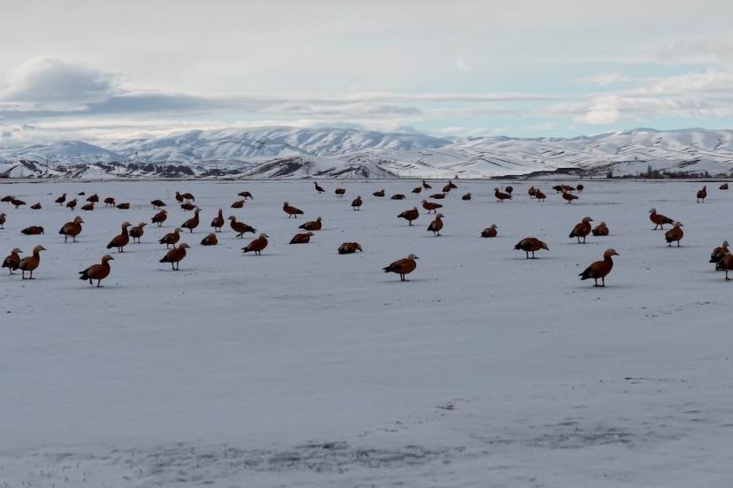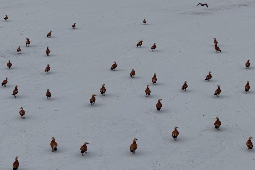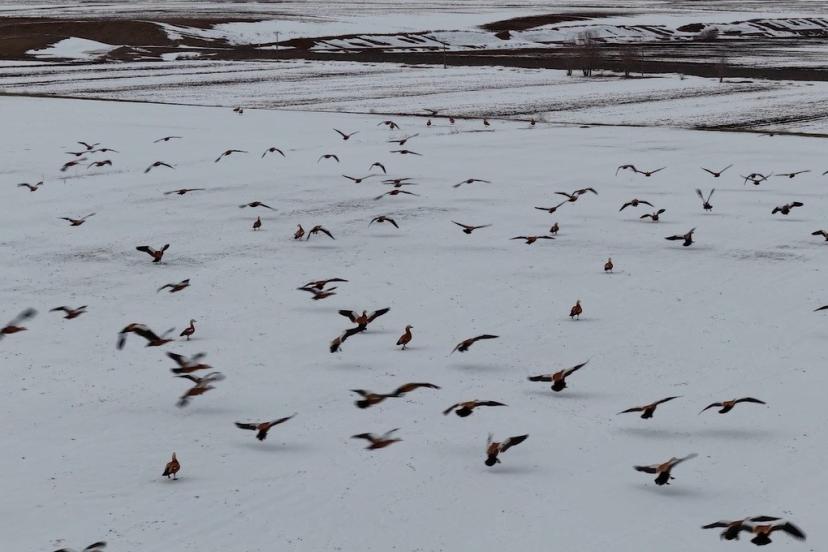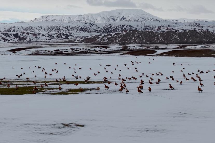Görüntü yönetmeni Mustafa Başgöze tarafından drone ile kaydedilen görüntülerde, ördek türü olan angut kuşlarının Erzincan Ovası’nda karlı arazide sürü halinde dolaştığı görüldü.