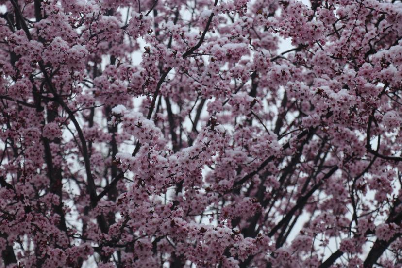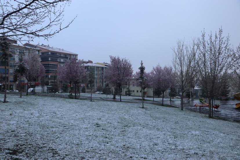 Baharın gelişiyle birlikte çiçek açan bazı ağaçlar ise yağan karla kaplandı. Ortaya çıkan görüntüler, mevsimlerin iç içe geçtiği nadir anlardan biri olarak dikkat çekti.