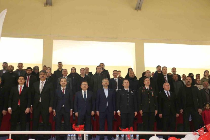Resmi törenin ardından kutlama programı, Aşkale Gençlik ve Spor İlçe Müdürlüğü Kapalı Spor Salonu’nda devam etti. Buradaki program da saygı duruşu ve İstiklal Marşı’nın okunmasıyla başladı.
