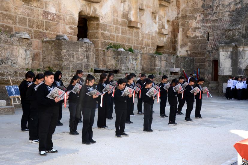 İlk Tören Cumhuriyet Meydanı'ndaki Atatürk büstü önünde saygı duruşu, İstiklal Marşı ve ardından çelenk sunumuyla başladı. Buradaki törenin ardından etkinlikler Tarihi Antik Aspendos Antik Tiyatrosu'nda devam etti. Antik tiyatrodaki törene Kaymakam Cemal Şahin, Belediye Başkanı Kadir Kumbul, İlçe Jandarma Komutanı Üsteğmen Ali Duman, İlçe Milli Eğitim Müdürü İkram Ekiz, kurum müdürleri, STK temsilcileri, öğretmenler, vatandaşlar ve öğrenciler katıldı.