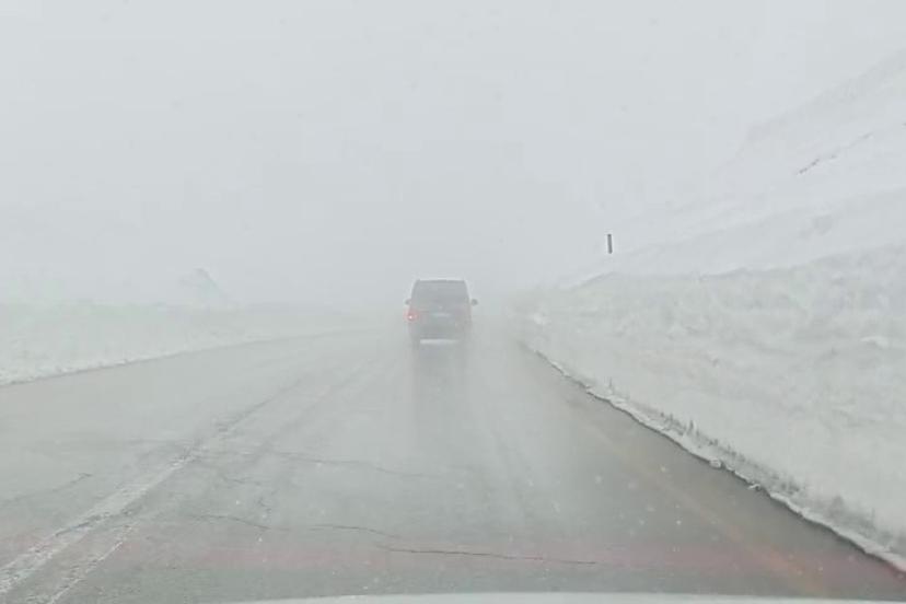 Erzurum-Tekman karayolu üzerindeki 2 bin 885 rakımlı Palandöken Geçidi’nde baharda kar ve tipi etkisini sürdürüyor.
