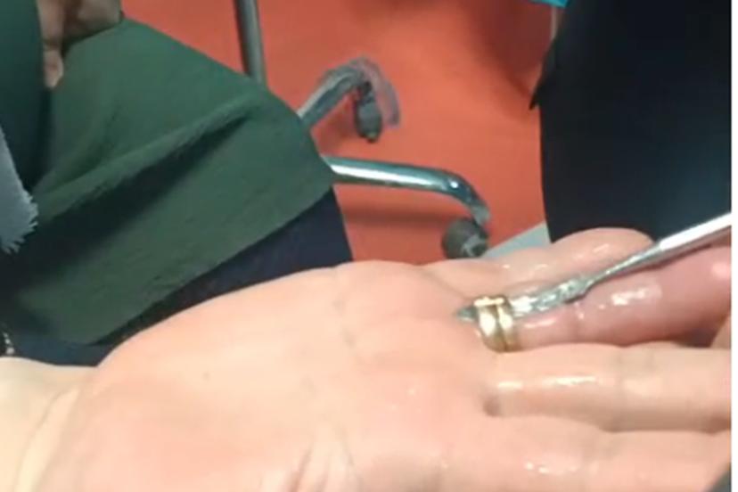 Hastaneye gelen itfaiye ekipleri, doktor kontrolü ve gözetiminde özel ekipman kullanarak sıkışan yüzüğü dikkatli bir şekilde çıkardı.