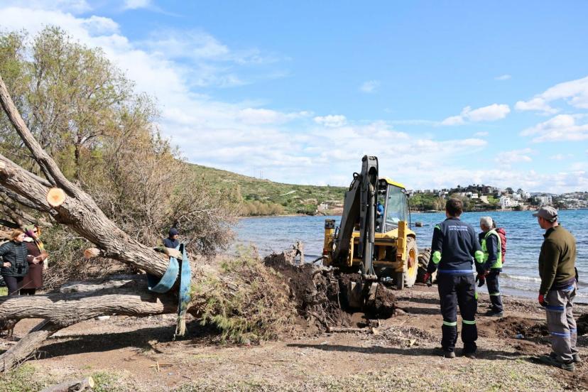 Bodrum'da fırtınada devrilen ılgın ağaçları yeniden toprakla buluşuyor