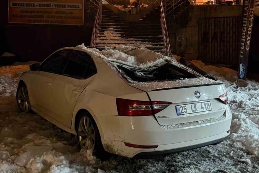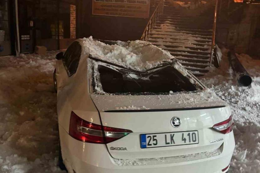 Erzurum’da bir binanın çatısından düşen kar kütlesi park halindeki otomobile büyük zarar verdi.
