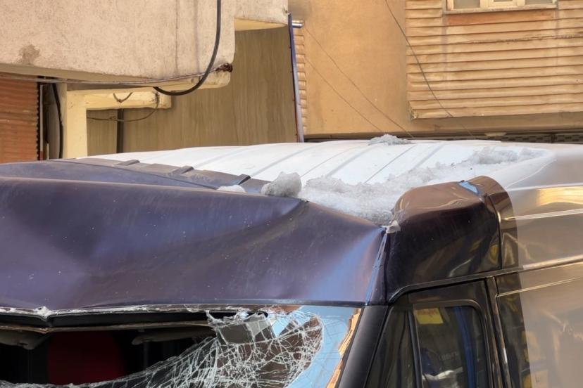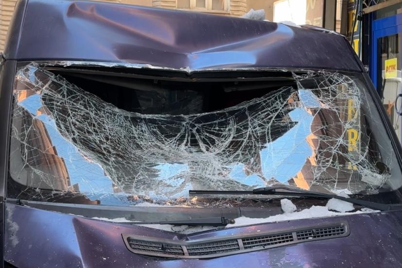 Hakkari’nin Yüksekova ilçesinde bir binanın 7’nci katından düşen kar kütlesi, seyir halindeki minibüse zarar verdi.