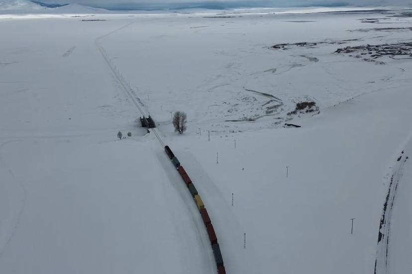Asya’yı Avrupa’ya bağlayan "Demir İpek Yolu" olarak adlandırılan Orta Koridor’da, Türki cumhuriyetlerden yola çıkan yük treninin karlar içindeki yolculuğu havadan görüntülendi. Tarihi Benliahmet İstasyonu mevkisinde çam ağaçları ve beyaz örtünün arasından süzülen tren, belgesel karelerini aratmayan görüntüler oluşturdu.