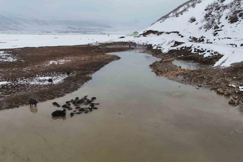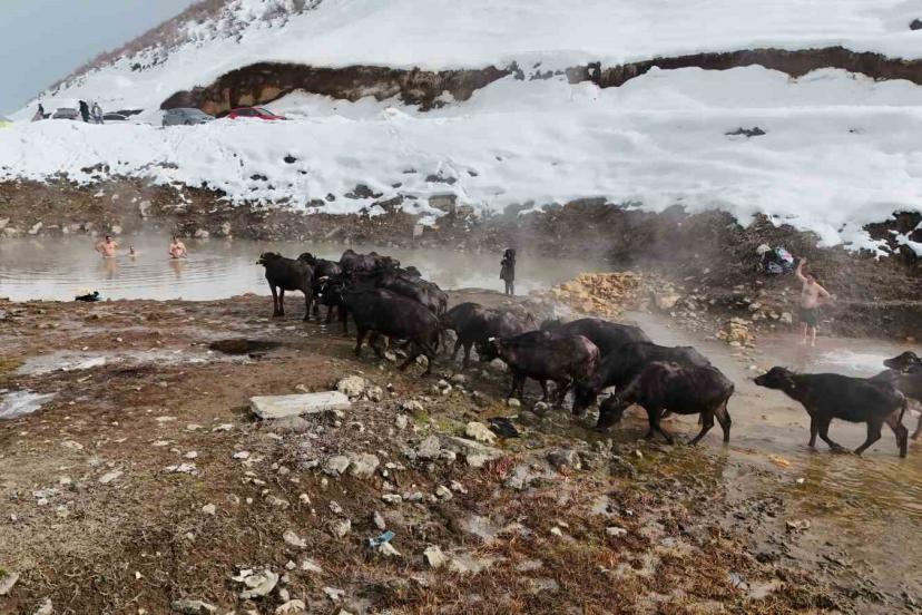Bitlis’in Güroymak ilçesine bağlı Budaklı köyünde bulan doğal kaplıcalar, havaların eksi derecelerde seyrettiği kış aylarında hem insanlara hem de bölgedeki hayvanlara keyifli anlar yaşatıyor.