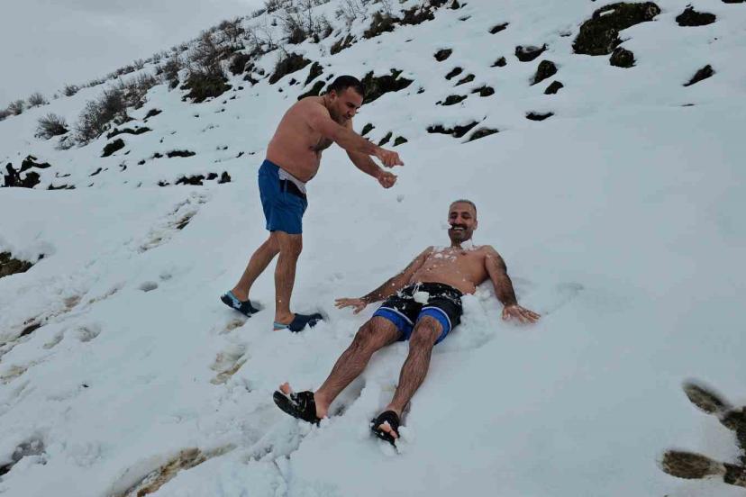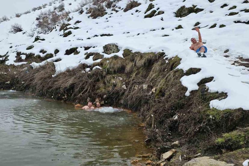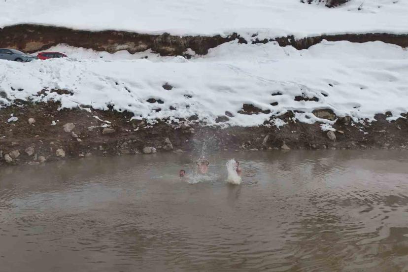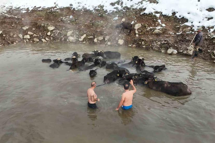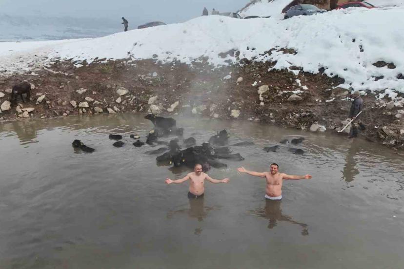 Budaklı köyünde dağ yamacındaki sazlık alanda bulunan doğal kaplıcalar, hava sıcaklığının eksi 25 dereceye kadar düştüğü kış günlerinde hem vatandaşlara hem de bölgedeki hayvanlara sıcak bir sığınak sunuyor. İl genelinde kar kalınlığının yer yer 1 metreyi bulduğu bölgede, bembeyaz kar örtüsüyle çevrili kaplıcanın 35-40 dereceyi bulan sıcak suyu dikkat çekici görüntüler oluşturuyor. Dondurucu havaya rağmen sıcak suyun rahatlatıcı etkisiyle yüzmenin tadını çıkaran ziyaretçiler, kışın ortasında adeta doğal bir spa deneyimi yaşıyor. Kaplıcanın çevresinde toplanan hayvanların da sıcak sudan faydalanması ise doğayla iç içe tabloyu daha da dikkat çekici hale getiriyor. Bazı vatandaşlar sıcak sudan çıktıktan sonra kar banyosu yaparak yeniden kaplıcaya girerken, bu sıra dışı deneyim hem heyecanlı hem de keyifli anlara sahne oluyor. Dondurucu soğuğa rağmen kaplıcaya girerek sıcak suyun tadını çıkaran vatandaşlar ve mandalar kar manzarası eşliğinde yüzmenin keyfini sonuna kadar yaşıyor.