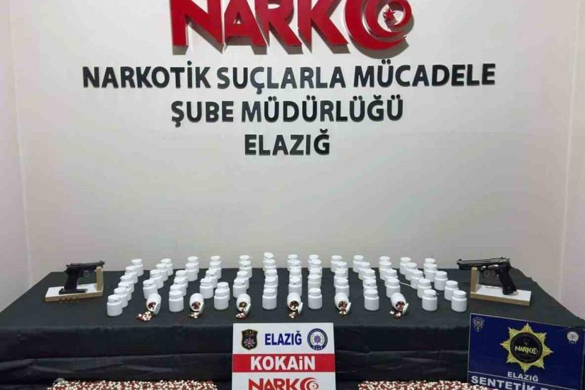 Elazığ Cumhuriyet Başsavcılığı koordinesinde Elazığ İl Emniyet Müdürlüğü Narkotik Suçlarla Mücadele Şube Müdürlüğü ekipleri, uyuşturucu ve uyarıcı madde ticareti, kullanımı ile sevkiyatının engellenmesine yönelik çalışmalarını sürdürüyor. Bu kapsamda belirlenen hedeflere yönelik geniş kapsamlı bir operasyon gerçekleştirildi. Eş zamanlı olarak 4 ayrı ikamet ve 1 araçta icra edilen operasyonda, narkotik ekiplerinin yaptığı detaylı aramalarda 6 parça halinde toplam 802 gram kokain, 69 kutu içerisinde 3 bin 873 adet sentetik ecza, 2 adet ruhsatsız tabanca ve bu tabancalara ait 4 adet fişek ele geçirildi. Suç unsurlarına el konulurken olayla bağlantılı olduğu tespit edilen 2 şüpheli şahıs kıskıvrak yakalanarak gözaltına alındı. Emniyet Müdürlüğü’ndeki işlemlerinin ardından adli makamlara sevk edilen 2 şüpheli şahıstan 1’i, çıkarıldığı mahkemece tutuklanarak cezaevine gönderildi.