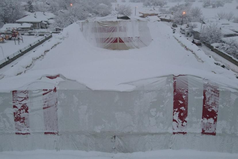 Erzincan’da kar birikintisi nedeniyle halı sahanın brandası çöktü, kimse zarar görmedi.
