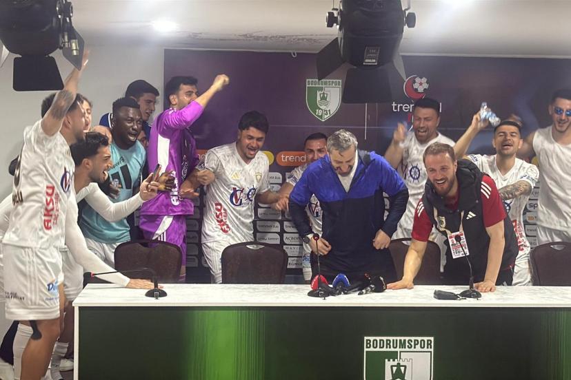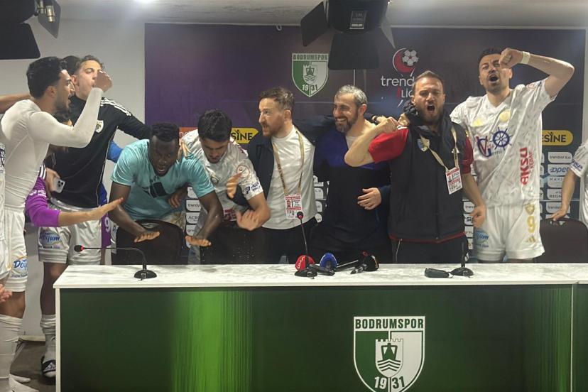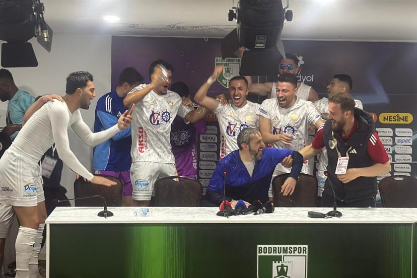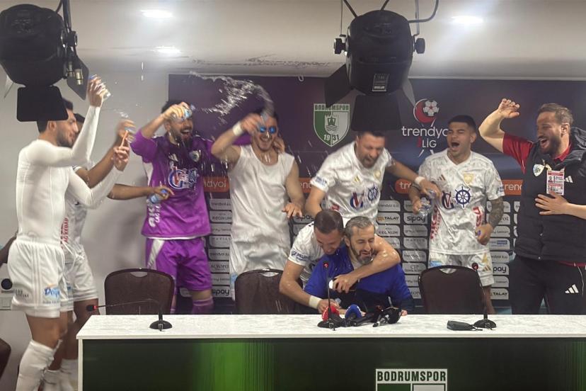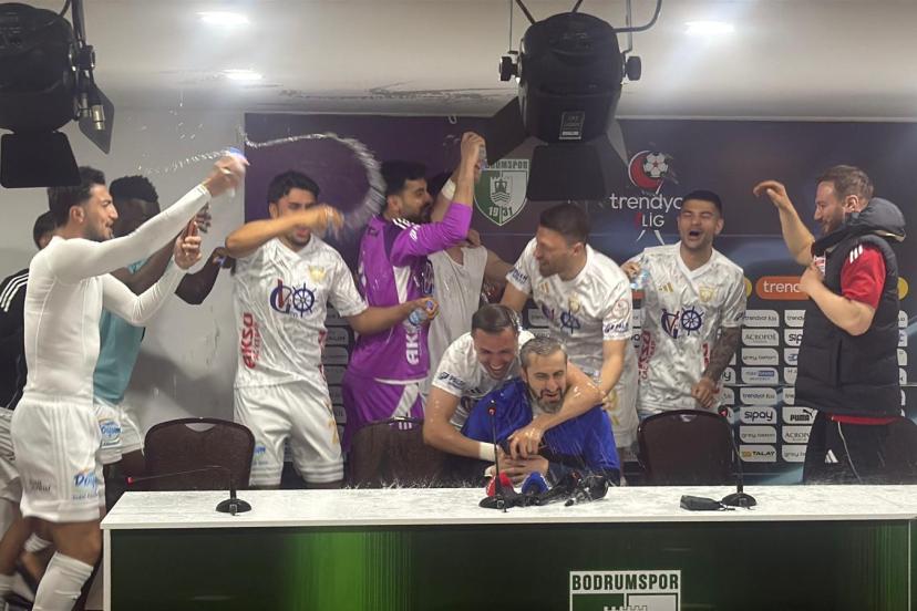 1’inci Lig’de Bodrum FK ile deplasmanda 1-1 berabere kalarak bitime 2 hafta kala 5 yıl sonra Süper Lig’e yükselmeyi garantileyen Erzurumspor’da, karşılaşma sonrası düzenlenen basın toplantısında teknik direktör Serkan Özbalta’ya futbolcularından sürpriz geldi. Toplantı sırasında içeri giren Erzurumsporlu futbolcular, gelenek gereği Özbalta’yı su şişeleriyle ıslatarak şampiyonluğu birlikte kutladı. Tecrübeli teknik adam, bu sürprizin ardından basın toplantısına yeniden başladı.