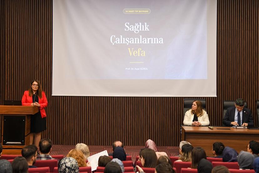 Programın açılış konuşmasını yapan Rektör Prof. Dr. Bülent Çakmak, 14 Mart tarihinin yalnızca bir meslek bayramı olarak görülmemesi gerektiğini ifade ederek bu özel günün insan hayatını merkeze alan sağlık hizmetlerinin önemini hatırlatan anlamlı bir gün olduğunu vurguladı. Sağlık çalışanlarının toplumun en zor anlarında umut olan, bilgi ve vicdanlarıyla insanlığa hizmet eden son derece kıymetli meslek mensupları olduğunu belirten Çakmak, sağlık hizmetlerinin fedakârlık, bilgi ve sorumluluk gerektiren bir alan olduğunu dile getirdi.