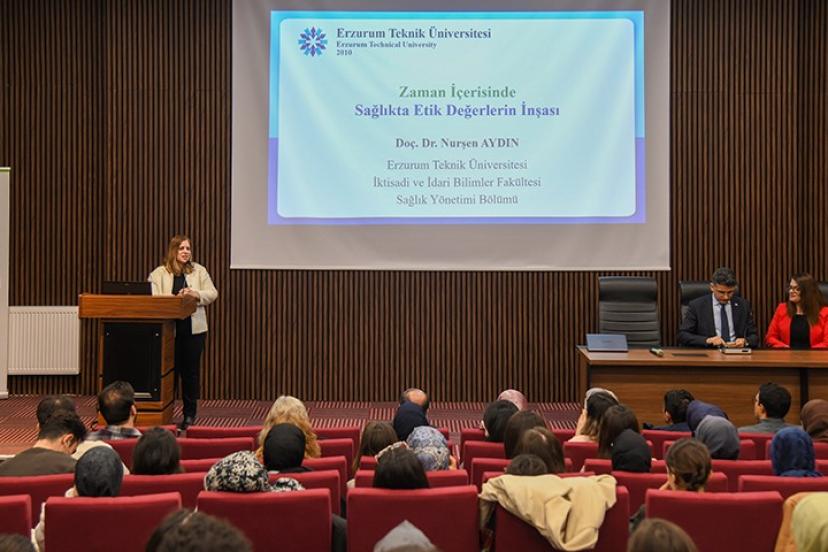 İktisadi ve İdari Bilimler Fakültesi Öğretim Üyesi Doç. Dr. Nurşen Aydın "Zaman İçerisinde Sağlıkta Etik Değerlerin İnşası" başlıklı sunumunda sağlık alanında etik anlayışının tarihsel süreç içerisindeki gelişimine değinerek, etik ilkelerin sağlık hizmetlerinin niteliğini belirleyen en önemli unsurlardan biri olduğunu ifade etti.