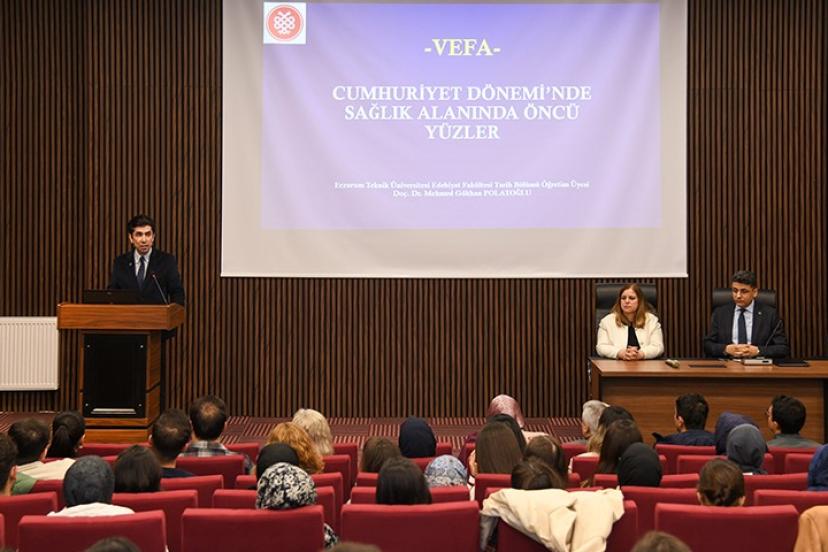 Edebiyat Fakültesi Öğretim Üyesi Doç. Dr. Mehmed Gökhan Polatoğlu ise "Cumhuriyet Döneminde Sağlık Alanında Öncü Yüzler" başlıklı sunumunda Cumhuriyet’in ilk yıllarından itibaren sağlık alanında önemli çalışmalar gerçekleştiren hekimler ve bilim insanlarının katkılarını ele alarak, Türkiye’de modern sağlık sisteminin gelişim sürecine öncülük eden isimleri ve bu isimlerin sağlık politikalarına olan etkilerini değerlendirdi.