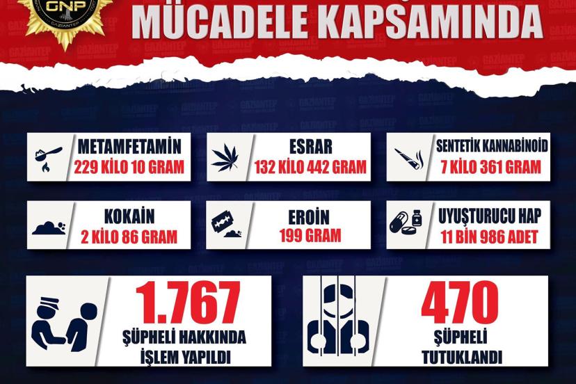 Gaziantep İl Emniyet Müdürlüğü ekiplerince 2026 yılının ilk üç ayında düzenlenen narkotik operasyonlarında bin 767 şüpheli yakalanırken, 470'i tutuklandı.