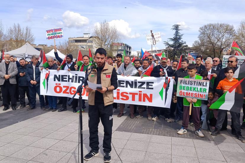 Meydanda STK'lar adına basın açıklamasını okuyan Muhammed Erkam Hekimoğlu, 7 Ekim'den bu yana işgal rejiminin sürdürdüğü saldırı ve katliamların yalnızca Gazze ile sınırlı kalmadığını, saldırganlıkların tüm bölgeyi ateş çemberine dönüştürdüğünü söyledi.