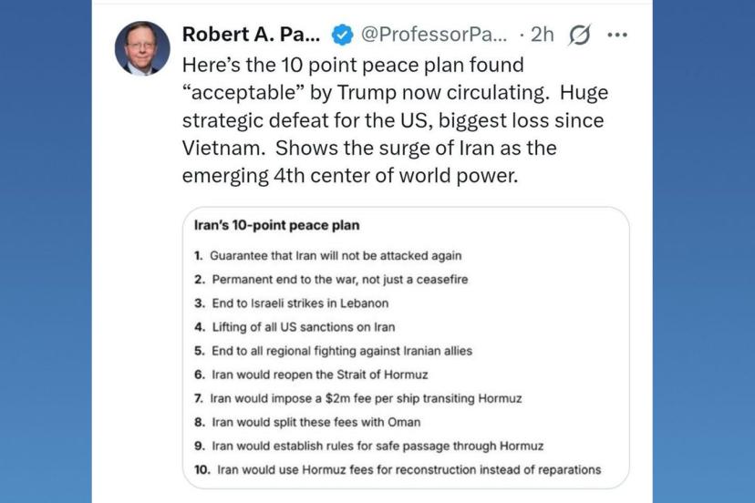 Şikago Üniversitesi Profesörü Robert Pape, ABD Başkanı Donald Trump tarafından kabul edilen 10 maddelik ateşkes planının Amerika için "Vietnam Savaşı’ndan bu yana en büyük stratejik yenilgi." olduğunu söyledi.
