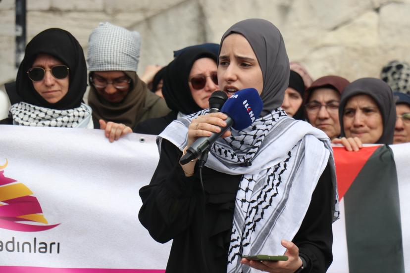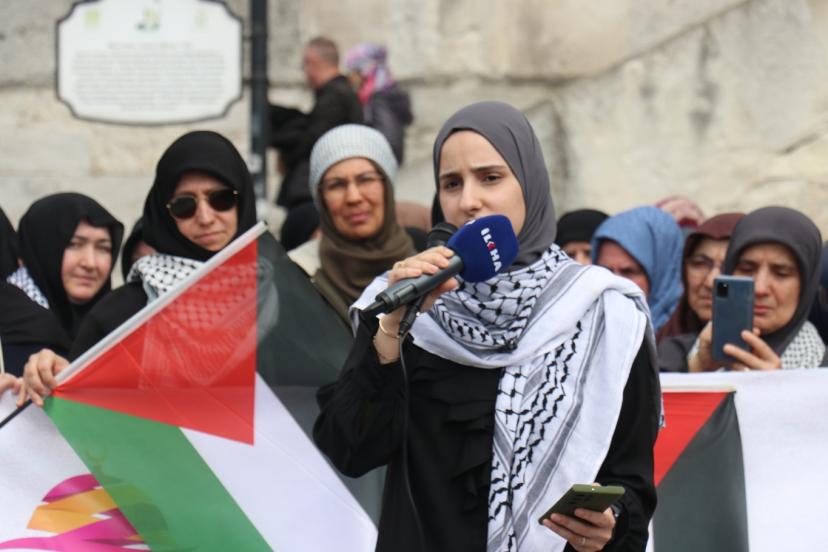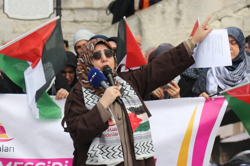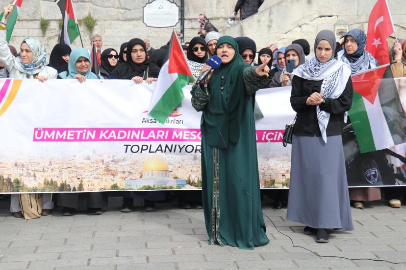 "Ümmetin Kadınları Aksa İçin Toplanıyor" mottosuyla gerçekleştirilen eylemde konuşan Aks Kadınları Derneği Başkanı Müyesser Yağız, "Ramazan ayının ilk haftasında Mescid-i Aksa kapandı. Ertesi gün Müslümanlar buna dayanamaz dedik ama ikinci gün de üçüncü günde kapalı kaldı. Yetmedi Kadir Gecesi de kapalı kaldı. Bayramda açılır, Müslümanlar buna dayanamaz dedik ama bayramda da mübarek Mescid-i Aksa, ilk kıblemiz kapalı kaldı. İslam tarihinde Selahaddin-i Eyyubi'den bu yana ilk defa bu kadar kapalı kalıyor. Burada utancımızı haykırırken hiç kimse ümidimizi de kaybettiğimizi sanmasın. Biz Müslümanız ve ancak ölünce mücadelemiz biter. Bu işin emeklisi olmaz, rahmetlisi olur. Biz Mescid-i Aksa'yı savunmaya devam edeceğiz." dedi.