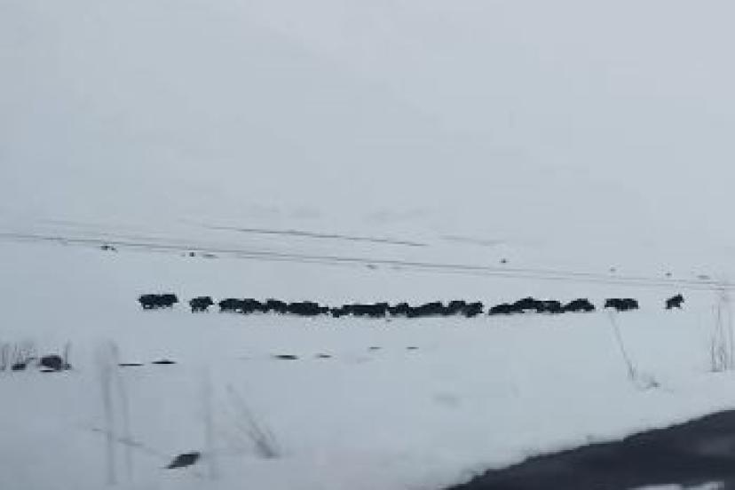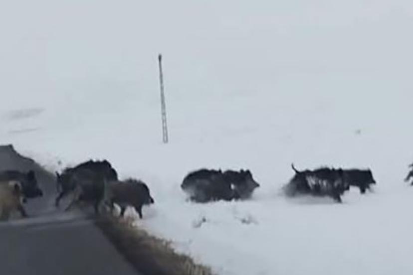 Ardahan’da zaman zaman karayoluna kadar inen yaban domuzları bu kez karla kaplı Ardahan’ın Çıldır ilçesinde karayolundan geçerken sürü halinde görüntülendi. Çıldır ilçesine bağlı Yukarı Cambaz ve Aşağı Cambaz köyleri arasında bulunan karla kaplı arazide ilerleyen domuzlar, yoldan geçen vatandaşlarca cep telefonu kamerasıyla görüntülendi. Araçlarıyla köylerine giden vatandaşlar meradan geçerek ormanlık alana doğru ilerleyen domuzları cep telefonlarıyla kaydetti.