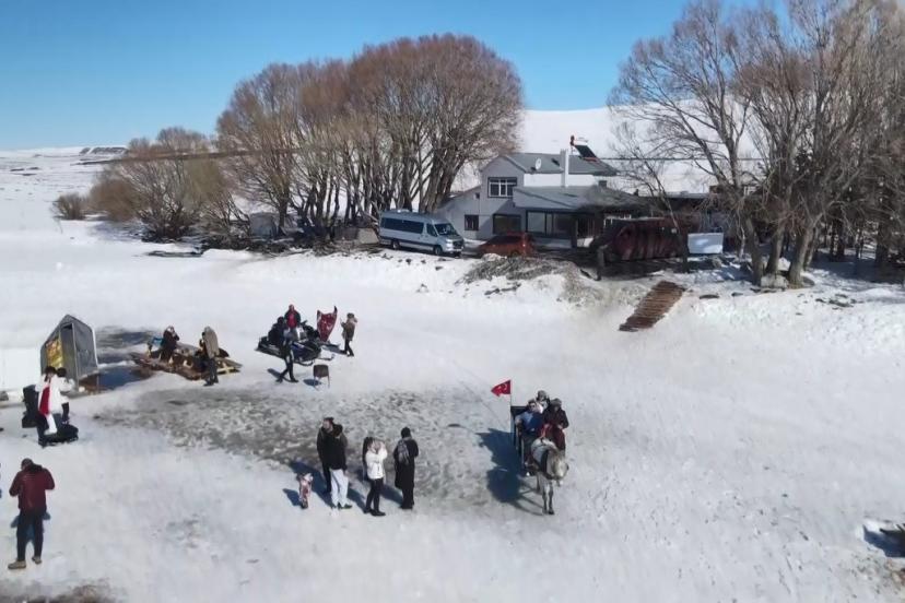 Kars’ın Arpaçay ilçesi sınırları içerisinde yer alan, kış aylarında tamamen donarak devasa bir pist haline gelen Çıldır Gölü, Ramazan ayında da yerli ve yabancı turistlerin akınına uğruyor. Gökyüzünün maviliği ile buz tabakasının birleştiği noktada, ziyaretçiler yüzeyi buz ile kaplı göl üzerinde yürümenin ve atlı kızaklarla sürat yapmanın heyecanını yaşıyor.