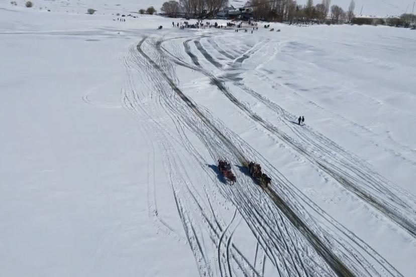 Doğu Anadolu’nun saklı denizi olarak adlandırılan Çıldır Gölü, büründüğü beyaz örtüsüyle macera tutkunlarını ağırlamaya devam ediyor. Yaklaşık 70 santimetre buz kalınlığına ulaşan göl, atlı kızakların "dörtnala" safarisine sahne oluyor.
