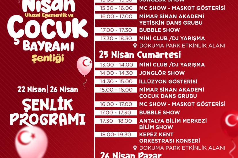 Kepez'in 23 Nisan Ulusal Egemenlik ve Çocuk Bayramı Şenlikleri, 22-26 Nisan tarihleri arasında dopdolu programıyla çocuklara ve ailelere unutulmaz anlar yaşatacak. Etkinliklerin merkezi ise kültür ve sanatın kalbi konumundaki Dokumapark olacak. Şenlikler, atölye çalışmalarından sahne gösterilerine, konserlerden bilim şovlarına kadar uzanan zengin bir programla gerçekleştirilecek.