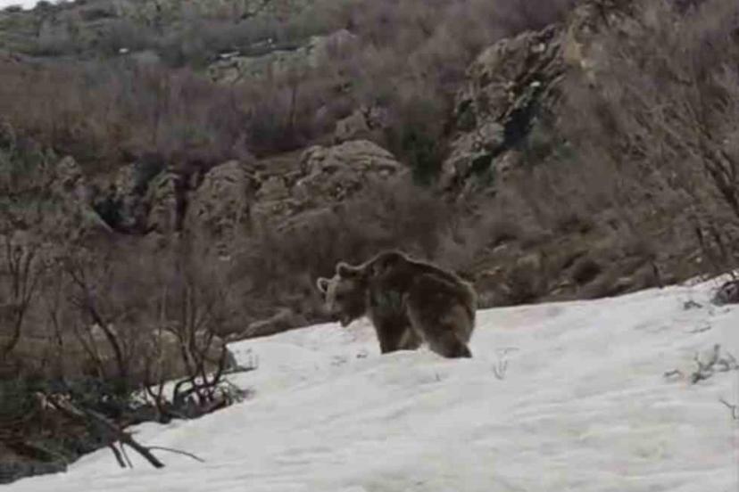Hakkari’nin Şemdinli ilçesinde kış uykusundan uyanan ayı, Alan köyü yakınlarında yiyecek ararken görüntülendi.