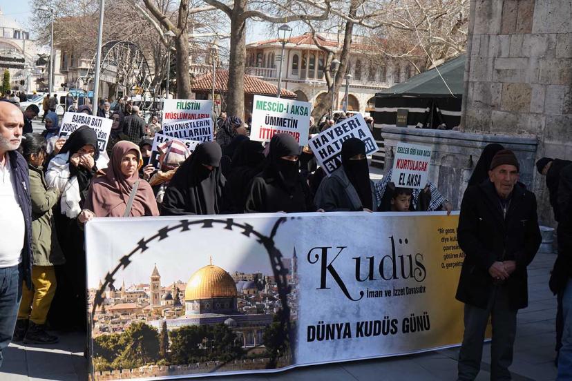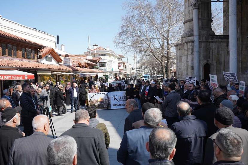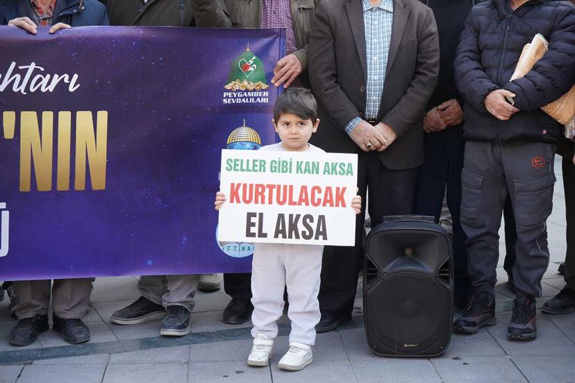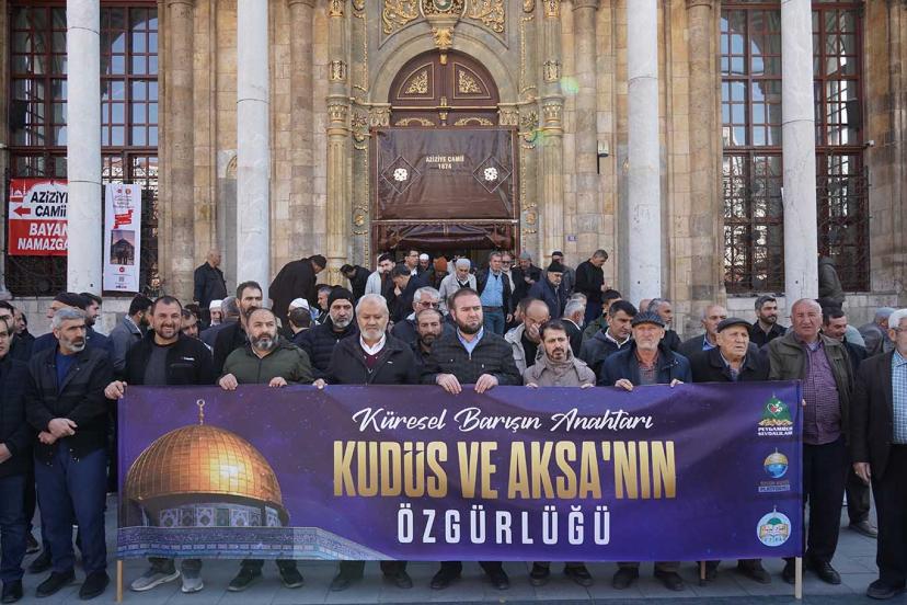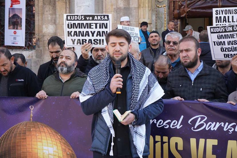 Konya'da Aziziye Camisi önünde Cuma namazı çıkışında gerçekleştirilen programda Peygamber Sevdalıları, Kudüs, Mescid-i Aksa ve Filistin’in özgürlüğü için çağrı yaptı.