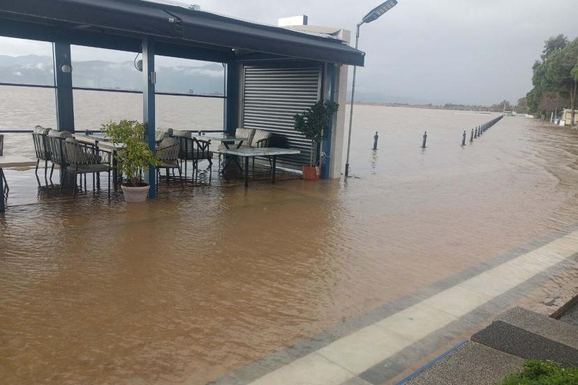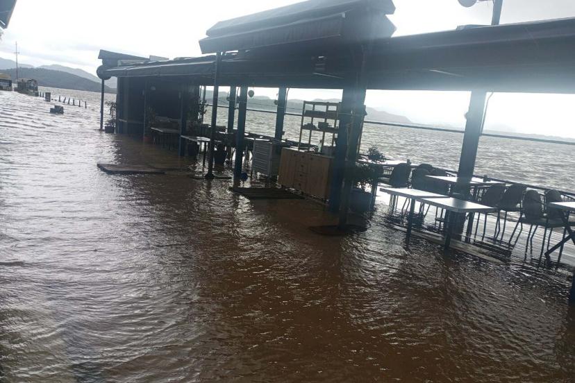 MUĞLA'nın Köyceğiz ilçesinde şiddetli yağış nedeniyle göl taştı, kordondaki iş yerlerinin masa ve sandalyeleri su içinde kaldı.