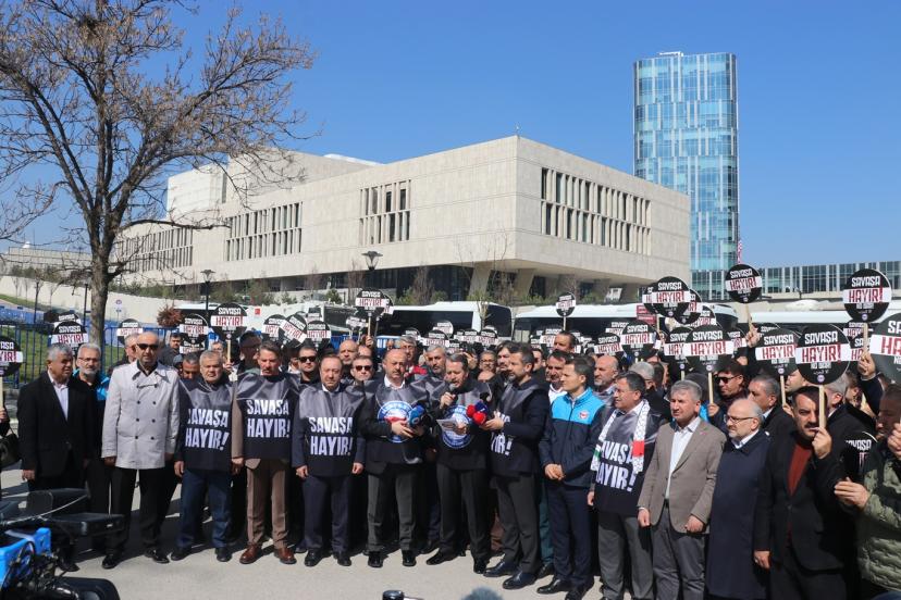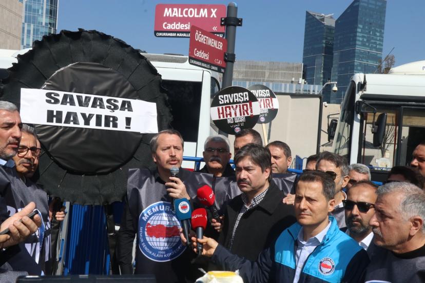 Soykırımcı siyonist rejim ve emperyalist ABD'nin bölgeyi kan gölüne çevirmesini protesto etmek amacıyla Memur-Sen tarafından Ankara'nın Çankaya ilçesi Malcolm X Caddesi üzerinde bulunan ABD Büyükelçiliği önünde “Savaşa Hayır” sloganıyla basın açıklaması düzenlendi. Programda siyah çelenk bırakma eylemi de gerçekleştirildi.
