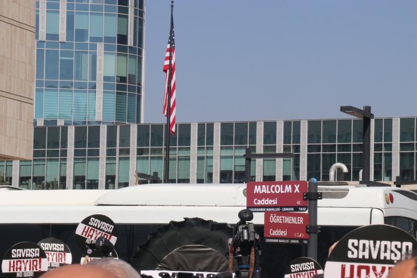 Basın açıklamasının ardından ABD Büyükelçiliği önünde, Malcolm X Caddesi tabelasının dibine üzerinde “Savaşa Hayır” yazılı siyah çelenk bırakıldı.