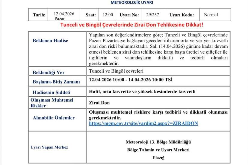 Meteoroloji 13’üncü Bölge Müdürlüğü’nden yapılan açıklamada, "Yapılan son değerlendirmelere göre; Tunceli ve Bingöl çevrelerinde Pazarı Pazartesiye bağlayan geceden itibaren orta ve yer yer kuvvetli zirai don riski bulunmaktadır. Salı (14.04.2026) gününe kadar devam etmesi beklenen zirai don tehlikesine karşı başta üretici ve çiftçiler ile ilgililerin e vatandaşların dikkatli tedbirli olmaları gerekmektedir" ifadelerine yer verildi.