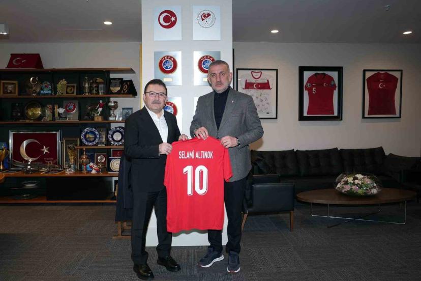 Buluşmada Türkiye Futbol Federasyonu Başkanı İbrahim Ethem Hacıosmanoğlu, AK Parti Erzurum Milletvekili Selami Altınok’a Milli Takım forması hediye etti.