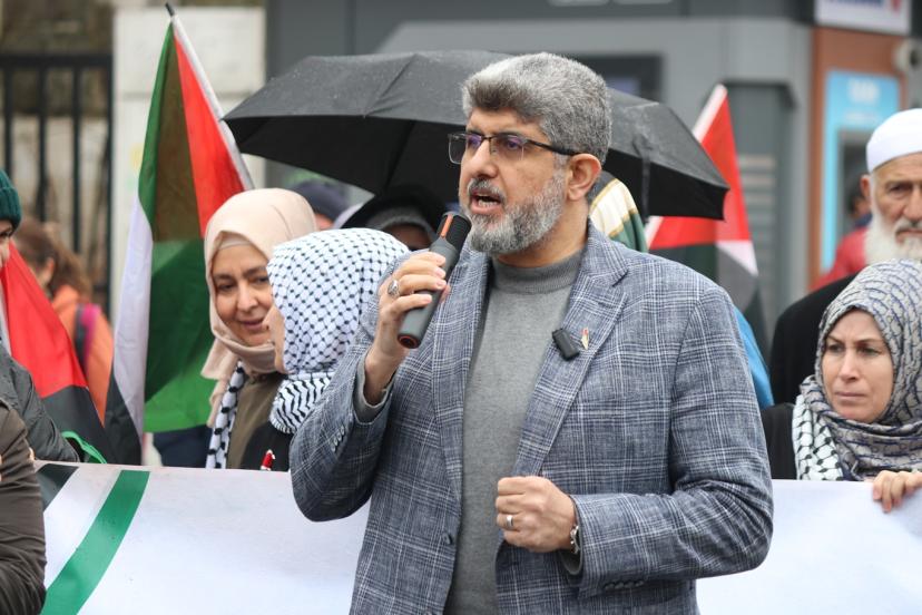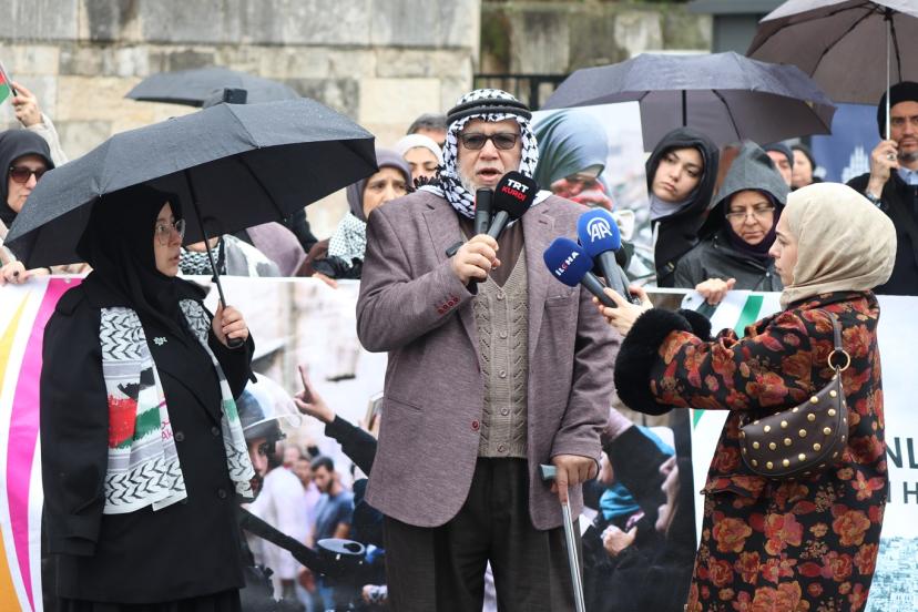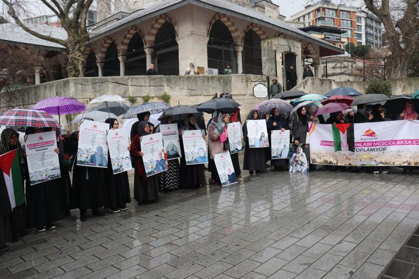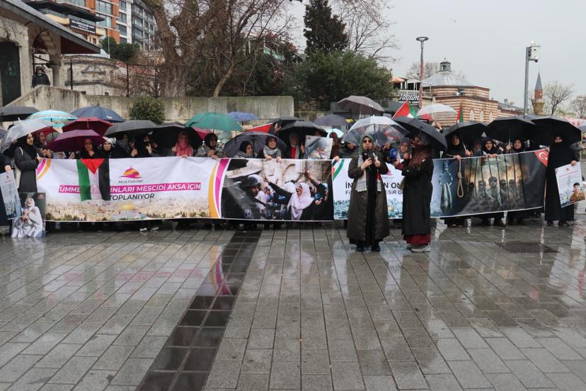 Cuma namazının ardından Üsküdar Mihrimah Sultan Camii önünde yoğun katılımla gerçekleştirilen programa; Dünya Müslüman Alimler Birliği Kudüs ve Filistin Komisyonu Başkanı Dr. Mervan Ebu Ras, Filistin konusunda çalışmalar yapan Mısırlı Dr. Emel Halife ve Filistinli Gazeteci Muin Naim konuşmacı olarak katıldı.