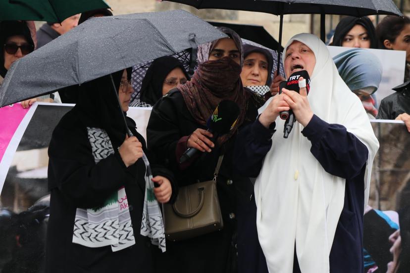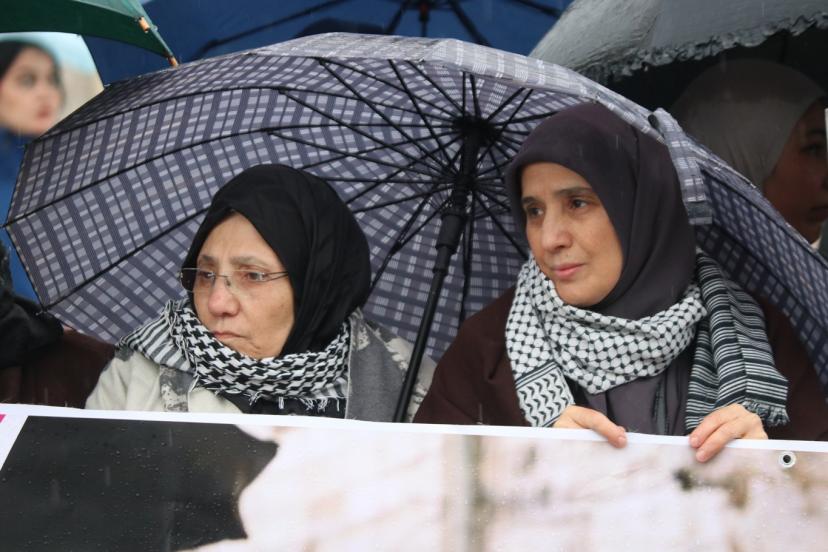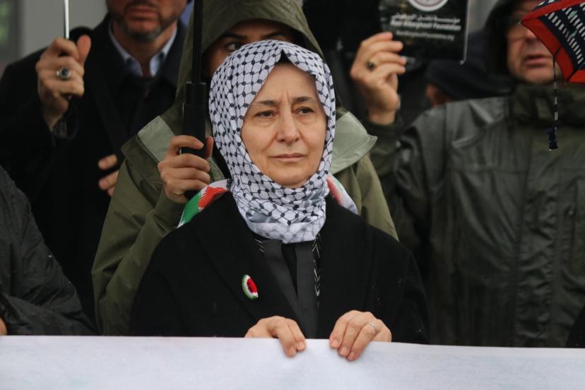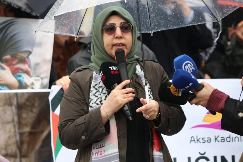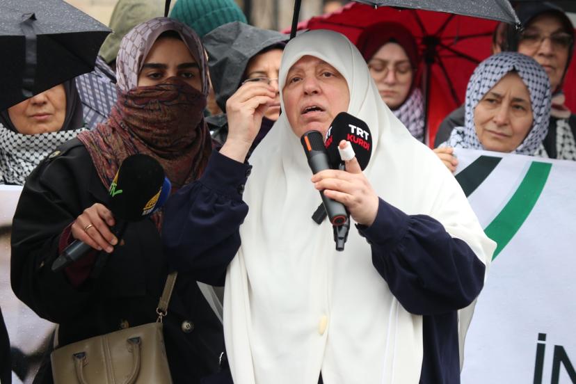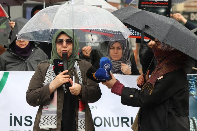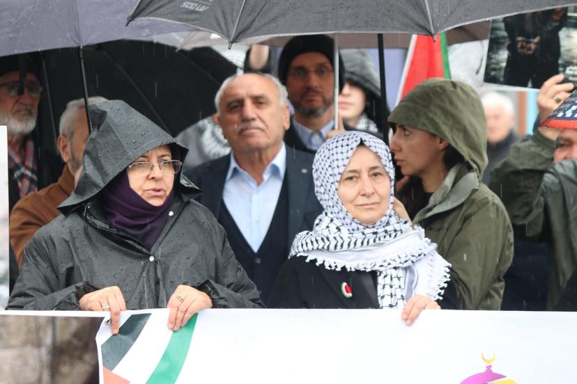 Dr. Emel Halife, "Ey İnsanlar! Biri size bugün bu yağmurda neden evlerinizden çıkıp geldiğinizi sorarsa onlara yaşayan bir insanın mazlumun yanında olması gerektiğini söyleyin. Ölüler bir yerde zulüm gördüklerinde tepki vermezler. Şu anda burada yaptığımız gibi Avrupa'da, Amerika'da da bunu görüyoruz. Onlar bizden binlerce kilometre uzaktalar ve Müslüman da değiller. Ancak onlar insani vicdanlarını dinleyip zulme karşı mazlumların yanında oluyorlar. Özellikle İspanya'da yapılan eylemlerde, tek başına ayakta duramayan, hatta elinde Filistin bayrağını dahi tutamayan bir yaşlı kadın, bayrağı elbisesine bağlayarak Filistin'e destek vererek zulme karşı durması, bu direnişin tüm dinlere göre olması gerektiğini gösteriyor." şeklinde konuştu.