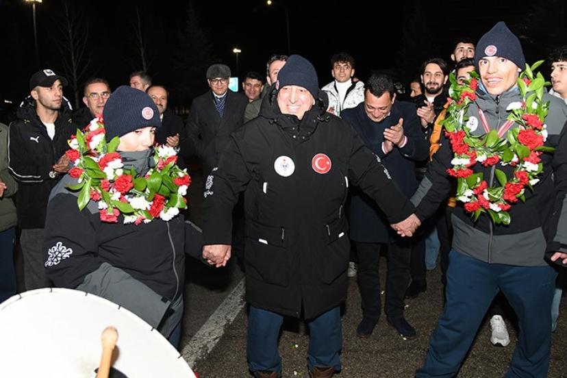 Avusturya’dan dört madalya ile Erzurum’a dönen Bingül kardeşler için havalimanında karşılama töreni düzenlenirken alanda ETÜ Rektörü Prof. Dr. Bülent Çakmak’ın yanı sıra çok sayıda akademisyen ve öğrenci yer aldı.