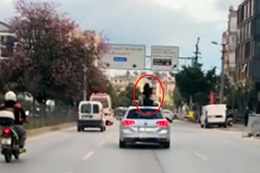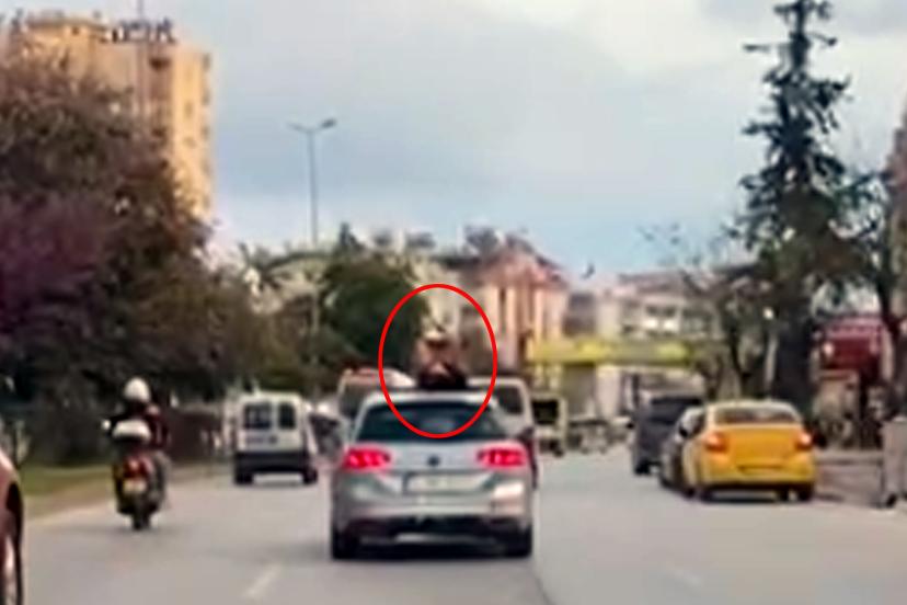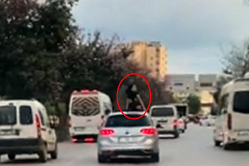 ANTALYA'da seyir halindeki otomobilin tavanından çıkarak dans eden kadın hem kendini hem de trafik güvenliğini tehlikeye attı. O anlar, cep telefonu kamerasına yansıdı.
