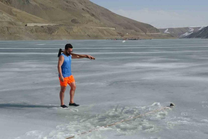 Van’da sıra dışı etkinlikleriyle tanınan maceracı bir öğretmen, barajdaki suyun buz tutmuş yüzeyini kırarak suya girdi. Balık avlamak yerine buzlu suyun içinde çay içen öğretmen, hem sağlıklı yaşama hem de kentin kış turizmine dikkat çekti.