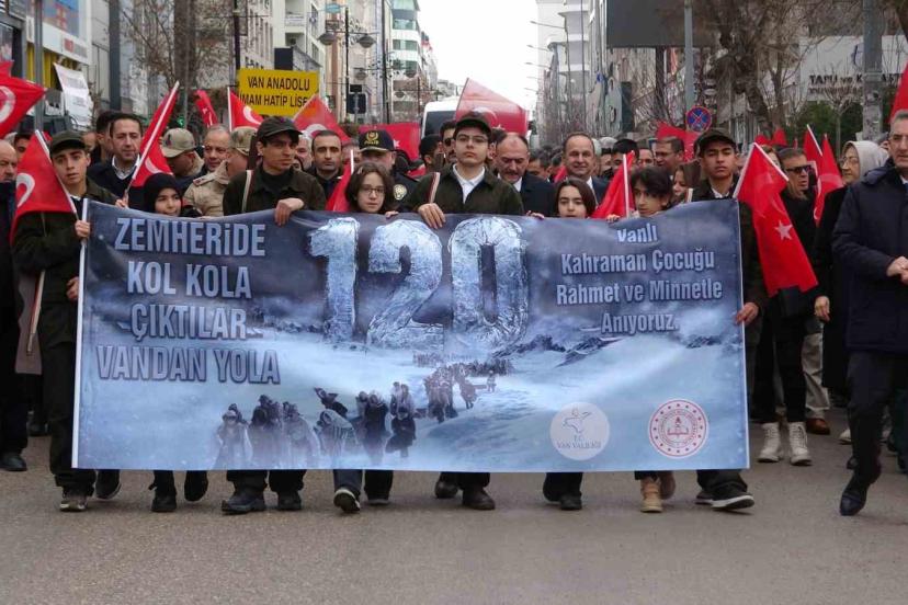Van’da, 1. Dünya Savaşı’nda Hoy Cephesi’ne cephane taşıdıktan sonra dönüş yolunda soğuk hava nedeniyle donarak şehit düşen 120 kahraman çocuk anısına yürüyüş düzenlendi.