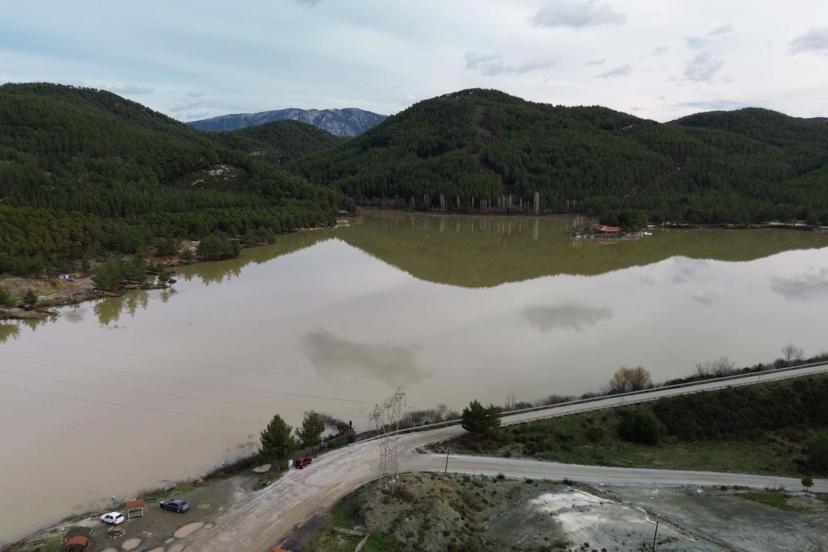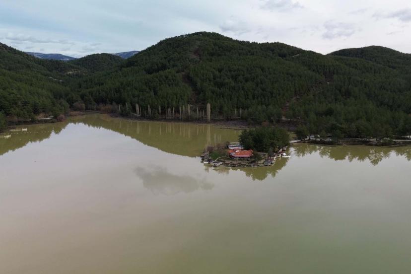 MUĞLA'da kuraklık nedeniyle su seviyesi ciddi oranda düşen ve son yağışlarla birlikte yeniden dolmaya başlayan Ula Göleti, dronla görüntülendi.