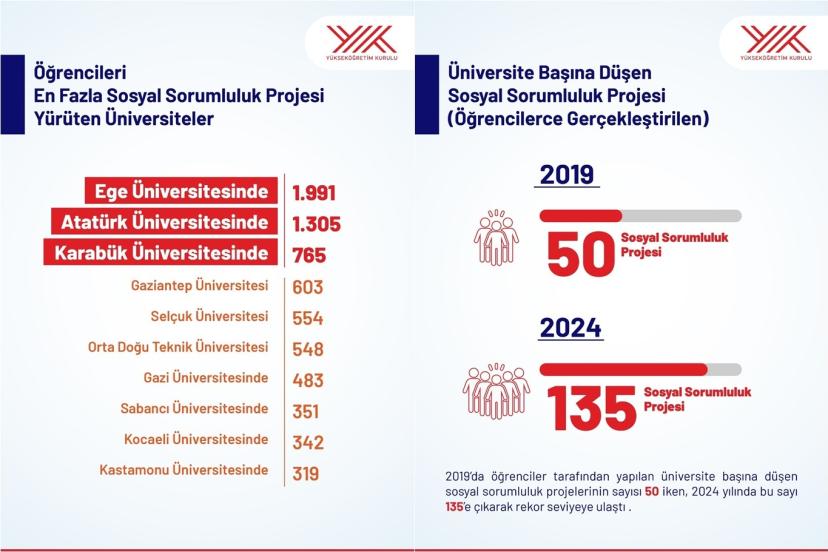 Yükseköğretim Kurulu tarafından yayımlanan 2025 Üniversite İzleme ve Değerlendirme Genel Raporu’na göre, 2024 yılında Türkiye’de üniversiteler ve öğrencileri tarafından toplam 15 bin 395 sosyal sorumluluk projesi gerçekleştirildi.