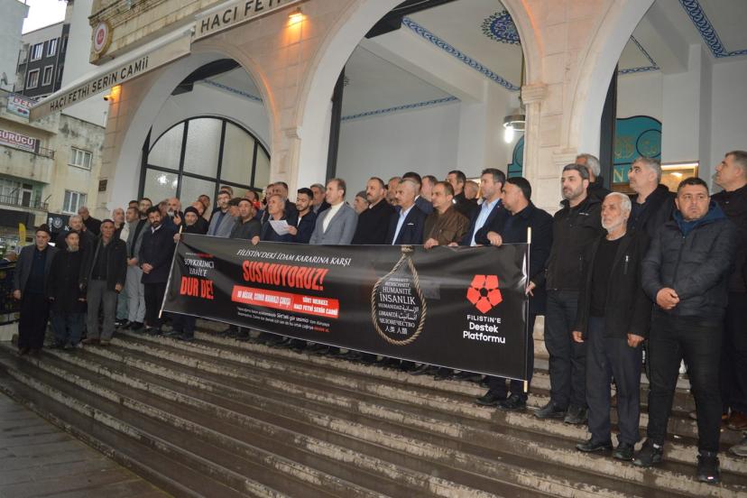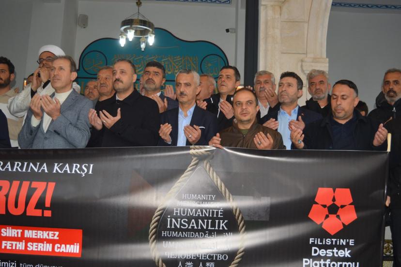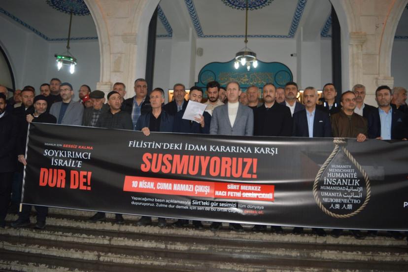 Filistin’e Destek Platformu tarafından Türkiye genelinde 81 ilde eş zamanlı basın açıklaması düzenlendi. Siirt’te Fethi Serin Camii’nde cuma namazı çıkışında gerçekleştirilen programda, siyonist rejimin Gazze’deki saldırıları ile Filistinlilere yönelik uygulamaları protesto edildi. Basın açıklamasını platform adına Mehmet Enes Sidal okudu.