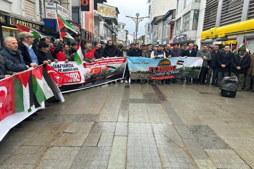 Cumhuriyet Caddesi’nde bir araya gelen platform üyesi dernek temsilcileri ve çok sayıda vatandaş, ellerinde Filistin bayraklarıyla siyonist rejimin soykırım politikalarına tepki gösterdi. Cuma namazı çıkışı gerçekleştirilen basın açıklamasını platform adına Cihangir Aslan okudu.