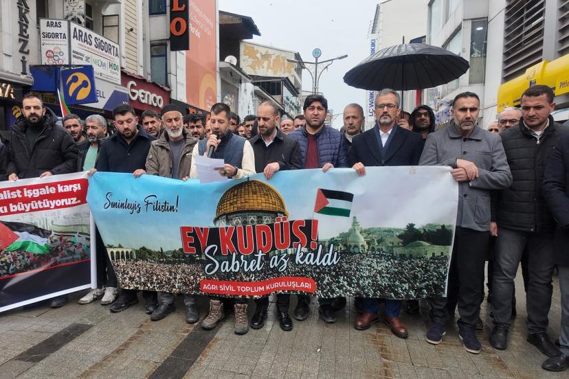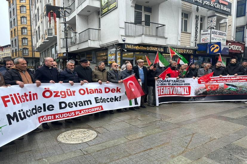 Ağrı Kudüs Platformu, Cuma namazı sonrası düzenlediği basın açıklamasıyla işgal rejiminin Gazze, Lübnan ve İran’daki saldırılarını sert bir dille kınadı. Yoğun katılımla gerçekleşen açıklamada, siyonist rejimin hukuksuz uygulamalarına karşı küresel direniş vurgusu yapıldı.