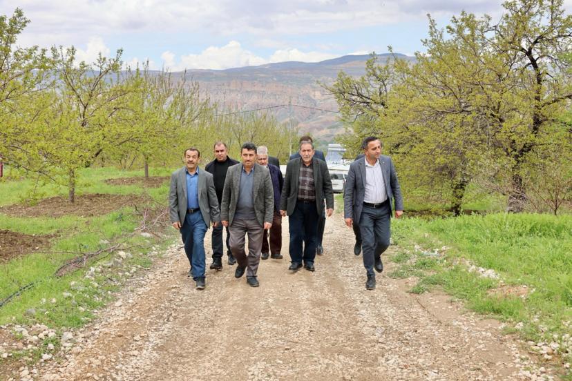 Akçadağ Belediye Başkanı Hasan Ulutaş, İlçe Tarım ve Orman Müdürü Hüseyin Gazi Karadağ, İlçe Ziraat Odası Başkanı Süleyman Boyraz ve Akçadağ Muhtarlar Derneği Başkanı İhsan Boyraz ile birlikte Çatalbahçe Mahallesi'nde dolu yağışından etkilenen çiftçileri ziyaret etti.