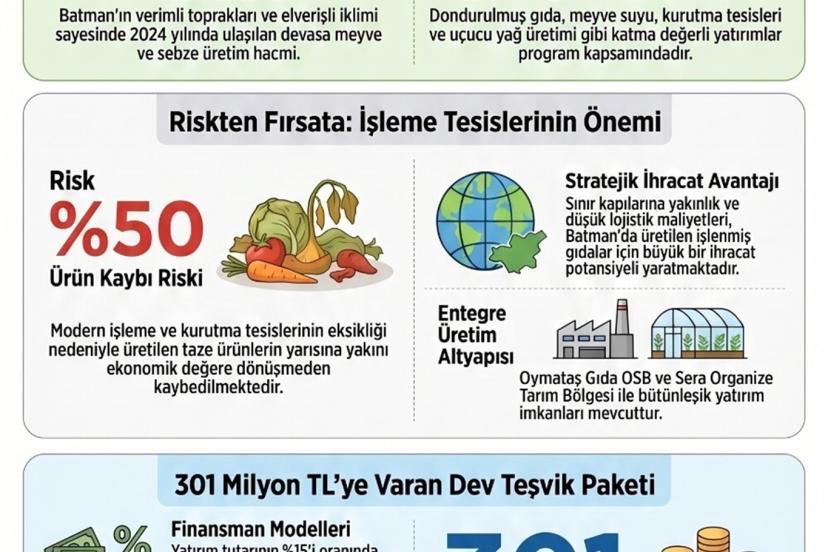 Meyve ve sebzelerin işlenmesi ve kurutulmasına yönelik tesislerin bu kayıpları azaltarak ürünlerin ekonomik değerini artırması hedefleniyor. Batman’ın sınır kapılarına yakın konumu nedeniyle lojistik avantaj sunduğu ve ihracata yönelik üretim açısından potansiyel taşıdığı değerlendiriliyor.