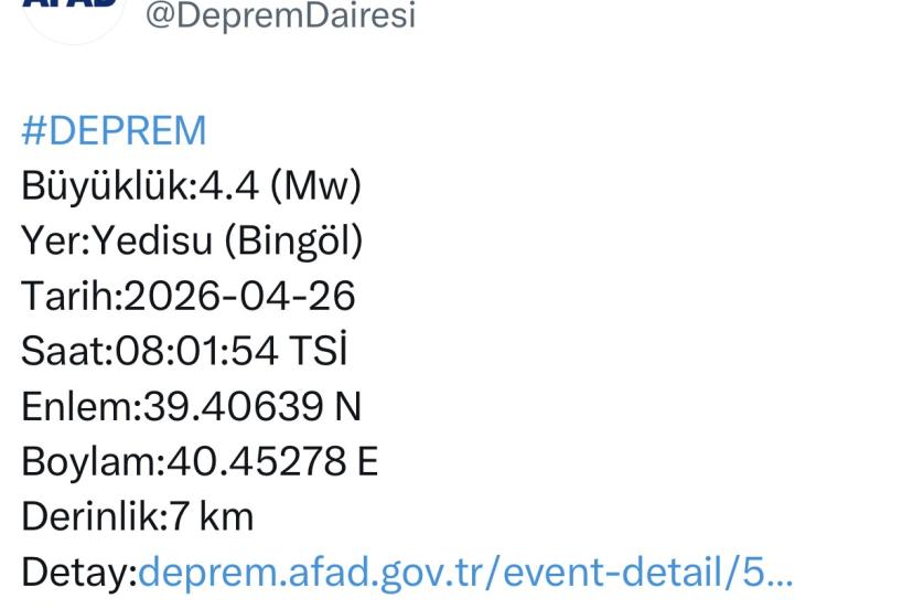 Afet ve Acil Durum Yönetimi Başkanlığı Deprem Dairesi Başkanlığından alınan bilgiye göre, saat 08:01’de merkez üssü Bingöl’ün Yedisu ilçesinde 4.4 büyüklüğünde deprem meydana geldi. Yerin yaklaşık 7 kilometre derinliğinde meydana gelen depremle ilgili olumsuz bir durum yaşanmadığı öğrenildi.