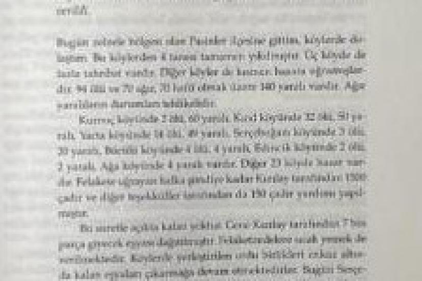 Yaşar Kemal, bölgedeki ilk gördüklerini şu çarpıcı ifadelerle anlatıyordu: "Bir soğuk, bir soğuk Öyle ki insanın içi çekiliyor. Sanki güneş bile donmuş." Depremin ardından köylerde karşılaştığı manzara, onun satırlarında bir felaket tasvirinden çok, insan ruhunun kırılganlığını anlatan bir tabloya dönüşür: "Evler yıkılmış Ama asıl yıkılan, insanların içindeki sesti. Konuşmuyorlar. Susmuşlar. İnsanoğlu felaketin ardından bir süre taş kesiliyor." Yaşar Kemal’in gözlemlerinde en dikkat çekici unsurlardan biri de doğa ile insan arasındaki sert karşılaşmadır: "Kar, yıkıntıların üstünü örtmüş. Hangi evin altında kim var bilinmiyor. Sessizlik, kar kadar ağır."